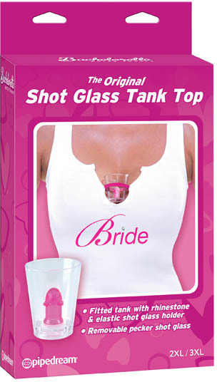 Get ready to turn the bachelorette party into an unforgettable night with a cheeky twist. The Bachelorette Bride Shot Glass Tank Top 2Xl/3Xl is not just your average tank top. It's a conversation starter, a party essential, and an absolute must-have for the bride-to-be's wild night out. Featuring the word "Bride" emblazoned across the front in bold pink and a removable penis shot glass nestled right in the V-neck, this top ensures that every glance is a reminder to raise a glass to the bride's big day.