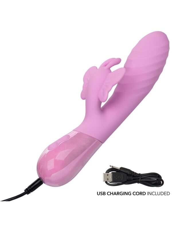 Let your desires take off with a sensational journey thanks to the Aura Dual Flutter. This powerful dual massager merges style and substance, serving up breathtaking pleasure with every use. The rippled shaft dives deep, providing rich internal stimulation, while the soft, fluttering butterfly teases and pleases the external hotspots that deserve a bit of love. These features combined with its body-safe silicone construction and fully waterproof design invite indulgence and adventure in the tub, shower, or anywhere the mood strikes.