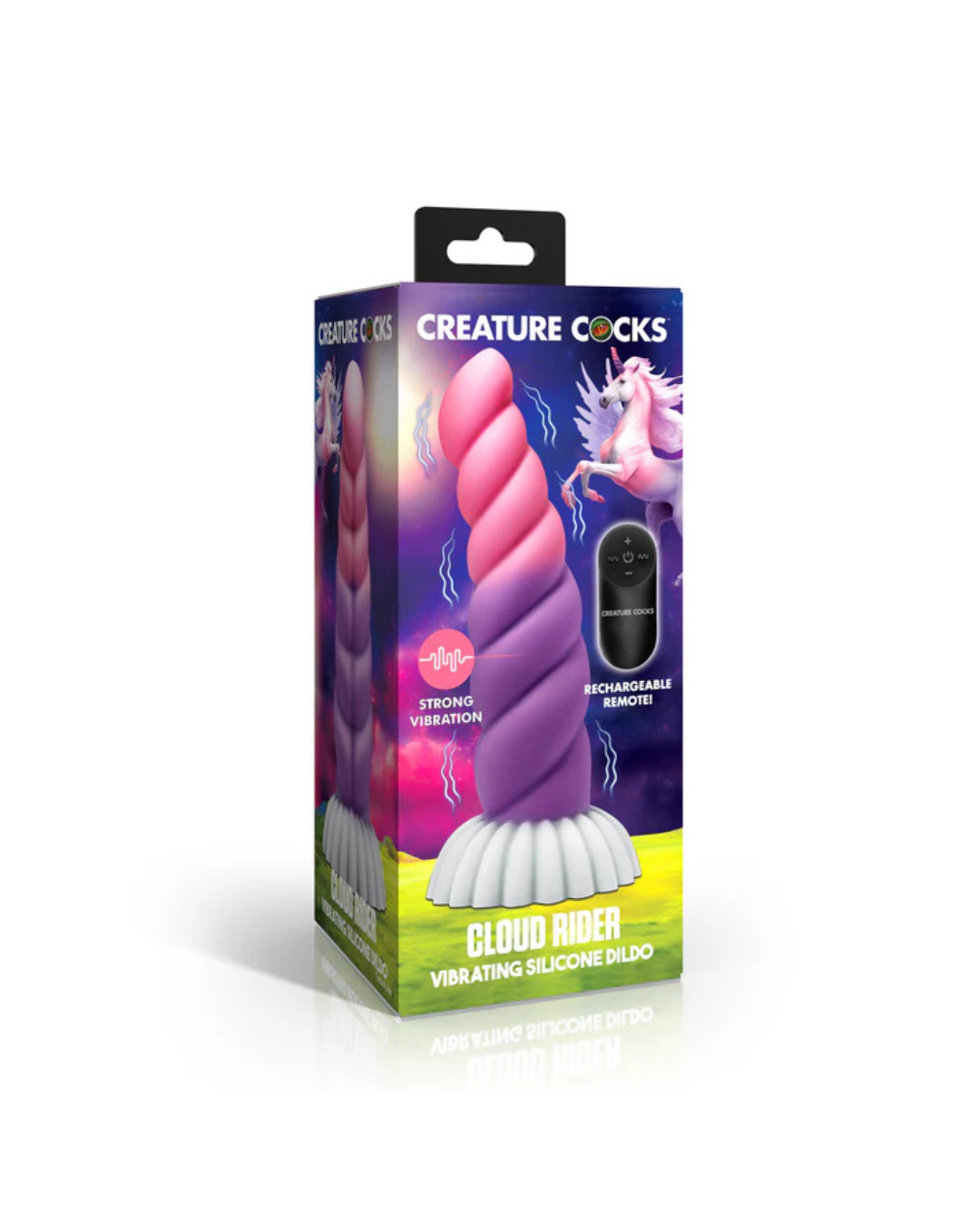 Elevate your fantasy life with the Cloud Rider Unicorn Silicone Dildo! Shaped like a magical unicorn horn and featuring colors of pink, purple, and white, this vibrating dildo has a small, round tip for effortless insertion. Its smooth, graduated bumps provide delightful sensations as you go deeper. Control 3 speeds and 7 vibration patterns using the rechargeable remote for tailored pleasure. The wide suction-cup base allows for hands-free use and compatibility with most strap-on harnesses. Made from premium, body-safe silicone and rated IPX7 waterproof, this toy can be used in the shower or underwater. Always pair with water-based lubricants!
