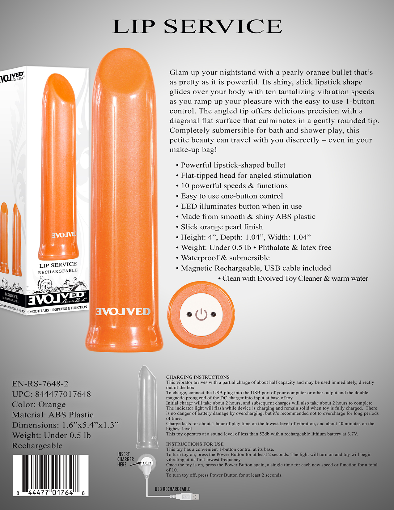 Transform how you treat her with a touch of elegance and a whole lot of power. The 4" Lip Service Clit Stimulator by Evolved Novelties isn’t just a pretty face — it’s the secret weapon of pleasure that’ll have her singing your praises. With its sleek lipstick shape and dazzling pearly orange finish, this beauty slides seamlessly over her skin, delivering intense vibrations that are as precise as they are pleasurable. Whether it's bath time or bedtime, this waterproof wonder is ready to elevate your shared pleasure.
