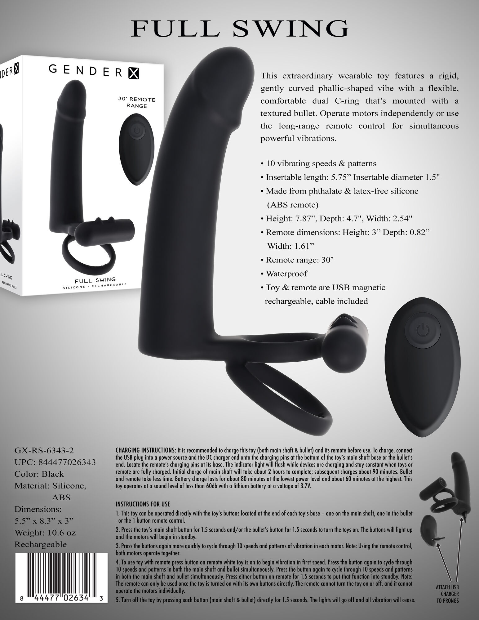 Strap in for an electrifying ride with the Full Swing Vibrating DP Cock Ring from Gender X. This isn't just a toy; it's a ticket to a pleasure-packed adventure. Imagine a phallic-shaped vibrator that's ready to go the distance, combined with a dual C-ring that’s all about comfort and power. Whether you’re flying solo or getting steamy with a partner, you’ll have the reins thanks to its long-range remote control. Get ready to unleash simultaneous vibrations that’ll leave you both breathless.