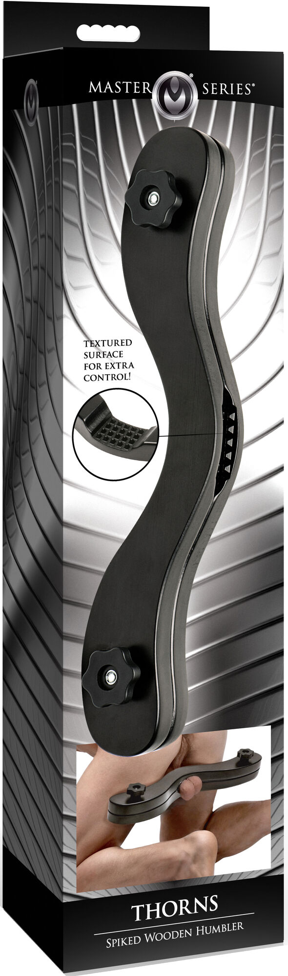 The Master Series Thorns Spiked Wooden Humbler by XR Brands is your ticket to the ultimate in control and play. This isn't just gear — it's a proper statement piece that'll keep you or your partner firmly in check. Made from smooth, dark Beechwood, this humbler is designed to lock you down and keep things in order. With its ergonomic design, it effortlessly fits behind the thighs, ensuring only the movement you want. And those flat-tipped spikes? They're there to remind you who's really in control. A twist of the adjustable knobs lets you decide just how intense the session gets.
